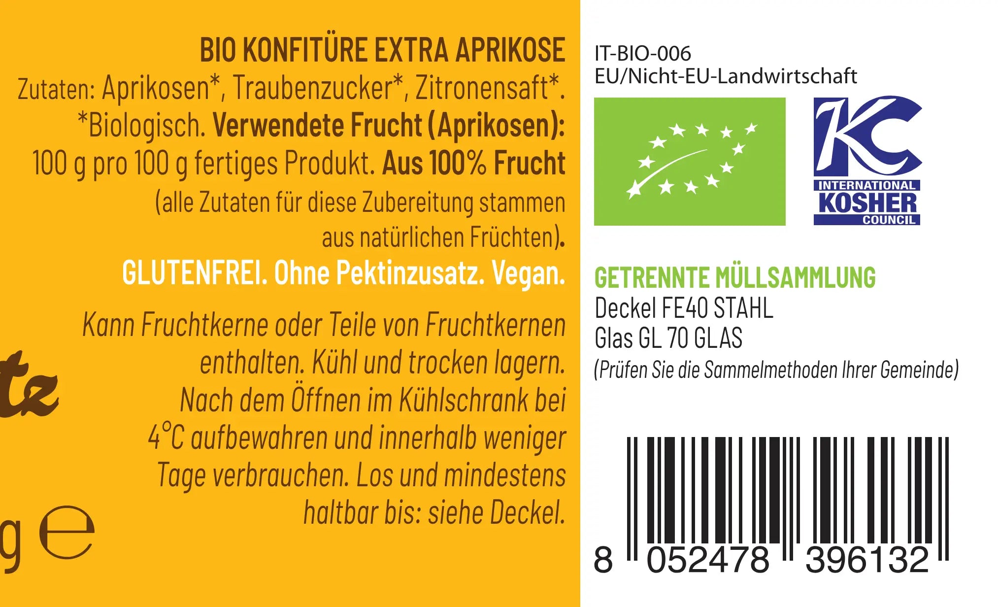 Entdecken Sie die köstliche Bio-Aprikosenmarmelade: eine ausgezeichnete handwerkliche Marmelade aus 100 % Bio-Aprikosen. Sie wird aus ganzen Aprikosen hergestellt und enthält kleine Fruchtstücke für ein authentisches Erlebnis.