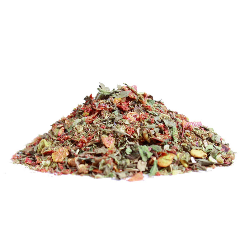 Diese Mischung ist perfekt für Salate, aber auch für Bowls, Suppen, Fischgerichte. Sie hat einen gehörigen Anteil fein gemahlenes Moringablatt und pures Johannisbeerpulver. Dazu mischen sich noch Nanaminze, Zitronengras und ein Hauch Dill. Zwiebel- und Tomatenpulver sowie Sonnenflocken sorgen für die Würze.